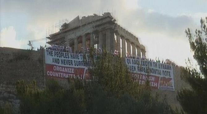 Πανό με το σύνθημα «Κάτω η δικτατορία του μονοπωλίου της Ευρώπης» κρέμασαν το πρωί μέλη του ΚΚΕ, στον Ιερό Βράχο της Ακρόπολης.