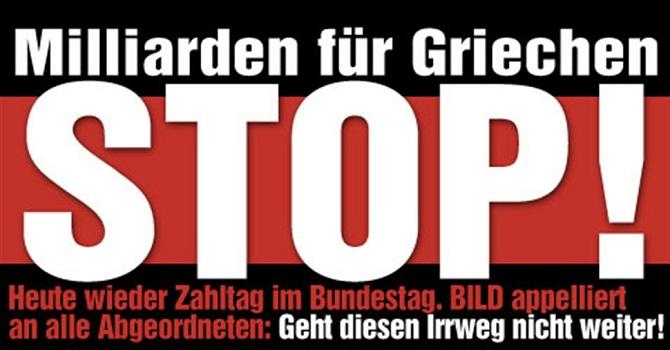 Με τίτλο «Δισεκατομμύρια για τους Έλληνες-Stop», σημερινό δημοσίευμα της γερμανικής εφημερίδας απευθύνει έκκληση πρός όλους τους Γερμανούς βουλευτές να καταψηφίσουν το δεύτερο πακέτο βοήθειας για την Ελλάδα.