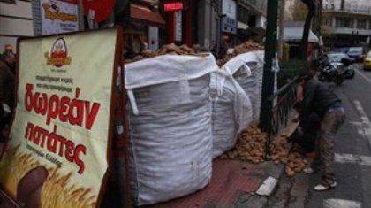 Δωρεάν πατάτες μοίρασε σήμερα το πρωί φούρνος στο κέντρο της Αθήνας, στην Ομόνοια. Όποιος αγόραζε ψωμί από το φούρνο έπαιρνε δώρο και μία σακούλα με... πατάτες. Με αυτήν την κίνηση πουλήθηκαν όλα τα καρβέλια του φούρνου αλλά εξαντλήθηκαν και οι πατάτες.