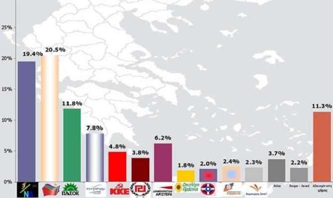Αναλυτικά, σύμφωνα με την έρευνα, το κόμμα του Αλέξη Τσίπρα είναι πρώτο κόμμα με 20,9% και ακολουθούν: Νέα Δημοκρατία με 19,4%, ΠΑΣΟΚ με 11,8%, Ανεξάρτητοι Έλληνες με 7,8%, Δημοκρατική Αριστερά με 6,2%, ΚΚΕ με 4,8%, Χρυσή Αυγή με 3,8%, Δημοκρατική Συμμαχία με 2,4%, Δημιουργία Ξανά με 2,3%, ΛΑΟΣ με 2% και Οικολόγοι Πράσινοι με 1,8%.