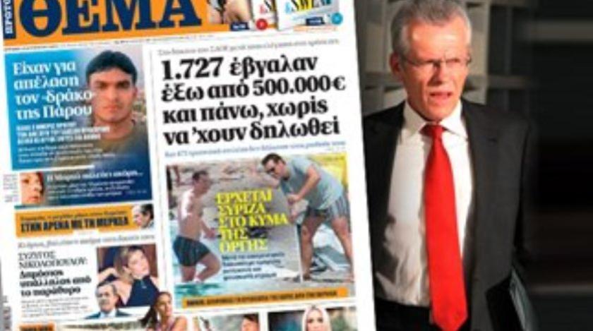 Προκαταρκτική εξέταση με αφορμή το αποκαλυπτικό πρωτοδέλιδο δημοσίευμα της εφημερίδας «ΠΡΩΤΟ ΘΕΜΑ» για 475 μεγαλοστελέχη τραπεζών που δεν έχουν υποβάλει φορολογικές δηλώσεις τα τελευταία τρία χρόνια, καθώς και για 1.727 πρόσωπα που διατηρούν μεγάλες καταθέσεις στο εξωτερικό, οι οποίες συνολικά υπερβαίνουν τα τρία δισ. ευρώ, διέταξε ο οικονομικός εισαγγελέας Γρηγόρης Πεπόνης.