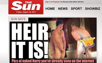 Όμως, σχεδόν η μισή πρώτη σελίδα της εφημερίδας Sun παρουσιάζει την Παρασκευή μια φωτογραφία του γυμνού πρίγκιπα να καλύπτει με τα χέρια του τα επίμαχα σημεία του σώματός του και πίσω του στο δωμάτιο του ξενοδοχείου στο Λας Βέγκας να είναι μια γυμνή γυναίκα.