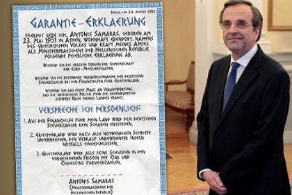 Σε μια προσπάθεια να «κεντρίσει» τον Έλληνα πρωθυπουργό έφτιαξε μια εγγυητική επιστολή με αρχαιοελληνική γραμματοσειρά και ζητάει από τον κ. Σαμαρά να την υπογράψει!
