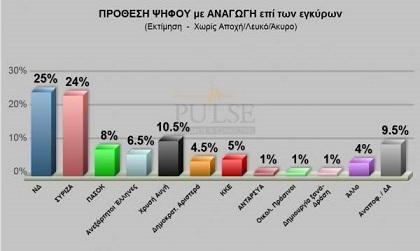 Στην έρευνα της εταιρείας “Pulse”, η Νέα Δημοκρατία παραμένει πρώτη με 25%. Ο ΣΥΡΙΖΑ βρίσκεται σε απόσταση αναπνοής με 24%, ενώ την έκπληξη κάνει η Χρυσή Αυγή που καταλαμβάνει την 3η θέση με ποσοστό 10,5%.