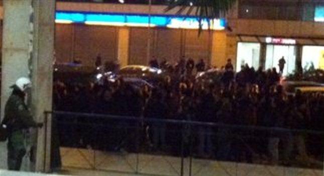 Οι συγκεντρωθέντες διαμαρτύρονται για τις αστυνομικές επεμβάσεις που επιχείρησε η αστυνομία νωρίτερα σήμερα στη βίλα «Αμαλία» και «Σκαραμαγκά», εκφράζοντας με αυτόν τον τρόπο τη συμπαράστασή τους στους 92 συλληφθέντες.