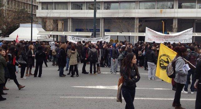 Έξω από το υπουργείο Οικονομικών, στην οδό Νίκης, βρίσκονται οι φοιτητές που συμμετέχουν στο συλλαλητήριο κατά του σχεδίου «Αθηνά».