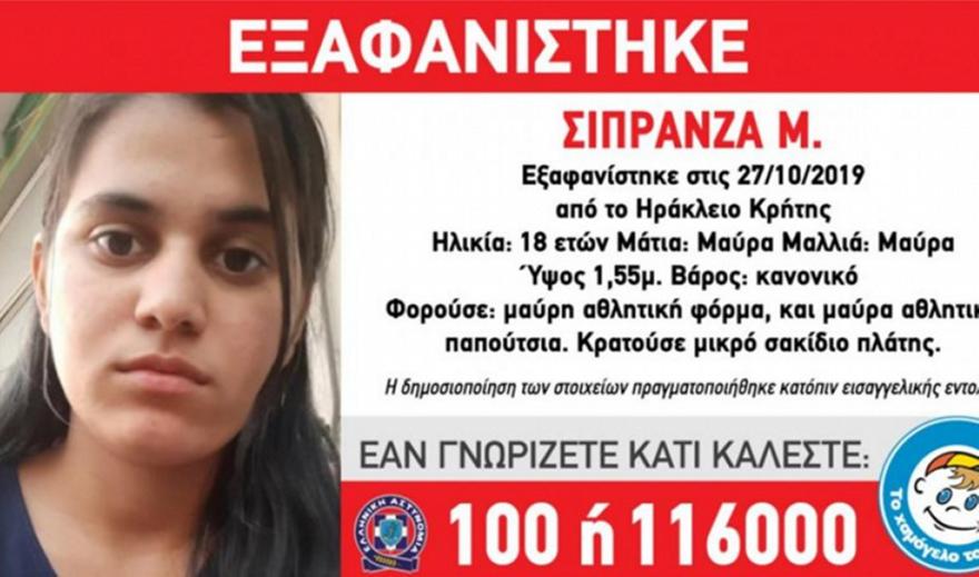 Ώρες αγωνίας βιώνει η οικογένεια της 18χρονης Σιπράνζας Μ., μητέρας ενός παιδιού, που εξαφανίστηκε την περασμένη Κυριακή από περιοχή του Ηρακλείου Κρήτης.