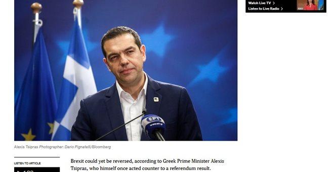 Το Brexit θα μπορούσε ακόμα να αντιστραφεί, σύμφωνα με τον Έλληνα Πρωθυπουργό Αλέξη Τσίπρα, ο οποίος κάποτε αντιτάχθηκε σε αποτέλεσμα δημοψηφίσματος σημειώνει το Bloomberg σε άρθρο του. «Ο ειδικός στην ανατροπή δημοψηφισμάτων, πιστεύει ότι το Brexit μπορεί να σταματήσει» αναφέρει χαρακτηριστικά το διεθνές πρακτορείο.