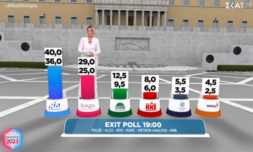 Το κοινό exit poll έξι εταιρειών δημοσκοπήσεων ανακοινώθηκε στις 7 το απόγευμα, με το που έκλεισαν οι κάλπες. Σημαντικό προβάδισμα της Νέας Δημοκρατίας, που μπορεί να ξεπεράσει και την διψήφια τιμή, δείχνουν τα πρώτα στοιχεία, καθώς το κυβερνόν κόμμα έχει 36-40%, με τον ΣΥΡΙΖΑ να ακολουθεί με 25-29%.