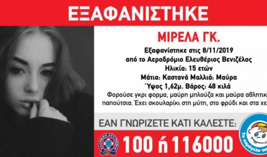 Η Μιρέλα Γκ. ετών 15, εξαφανίστηκε την Παρασκευή (8.11.2019) στις 14:00, από το αεροδρόμιο «Ελευθέριος Βενιζέλος». «Το Χαμόγελο του Παιδιού» ενημερώθηκε για την εξαφάνιση της Μιρέλα Γκ. σήμερα Σάββατο (9.11.2019), και προχώρησε άμεσα στη δημοσιοποίηση των στοιχείων της.