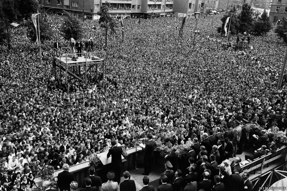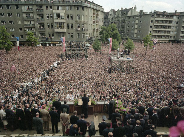 Μίλησε στα σκαλιά του Δημαρχείου του Βερολίνου, μόλις μερικά μέτρα μακριά από το Τείχος, το οποίο είχε χτίσει η Ανατολική Γερμανία 22 μήνες νωρίτερα.