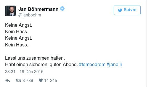Αλλά και μηνύματα πιο σύνθετα, όπως αυτό του γερμανού χιουμορίστα Jan Bohmermann, συγκλόνισαν την Γερμανία: «Οχι φόβος. Οχι μίσος. Οχι φόβος. Οχι μίσος. Να μείνουμε ενωμένοι. Να έχετε ένα καλό βράδυ, με ασφάλεια».