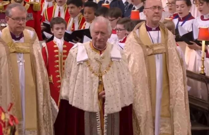 1:00 Ο Βασιλιάς Κάρολος Γ' και η σύζυγος του μπαίνουν στο Αβαείο του Ουεστμίνστερ από τη Μεγάλη Δυτική Πύλη και ξεκινάει η ακολουθία της Στέψης.