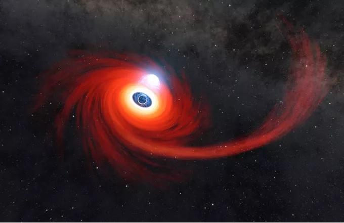 Ένας δίσκος θερμού αερίου στροβιλίζεται γύρω από μια μαύρη τρύπα που θυμίζει ένα μάτι. Το ρεύμα αερίου που «στεφανώνει» τη μαύρη τρύπα και αφήνει μια ουρά προς τα δεξιά είναι ό,τι απομένει από το αστέρι το οποίο «καταβρόχθισε» η μαύρη τρύπα.