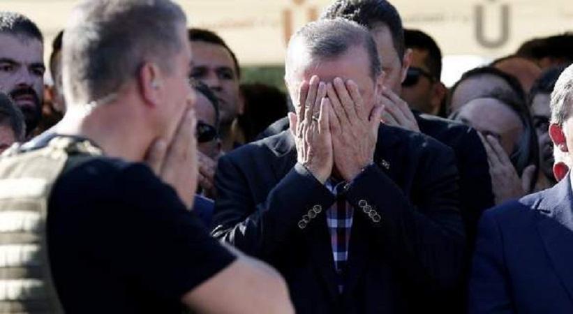 Ο επικεφαλής του τουρκικού κράτους, ο οποίος δεν θεωρείται ιδιαίτερα διαχυτικός στις δημοσίες εμφανίσεις του, ξέσπασε σε κλάματα ενώ εκφωνούσε τον επικήδειο λόγο σε ένα τέμενος στην ασιατική πλευρά της Κωνσταντινούπολης. Το θύμα ήταν φίλος του, ένας γνωστός διαφημιστής στην Τουρκία, και σκοτώθηκε μαζί με τον 16χρονο γιο του τη νύχτα της Παρασκευής προς Σάββατο από τους υποστηρικτές των πραξικοπηματιών.