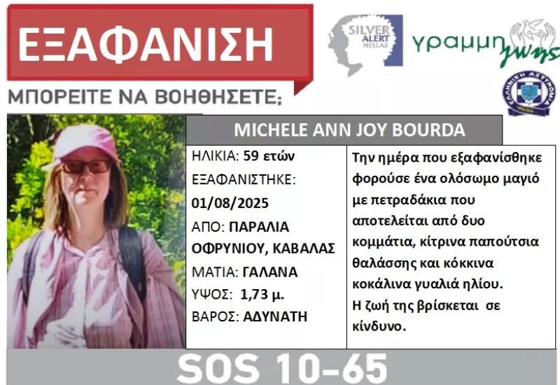 Συναγερμός έχει σημάνει για τη μυστηριώδη εξαφάνιση μίας 59χρονης γυναίκας, χθες το μεσημέρι, από παραλία της Καβάλας όπου είχε πάει για μπάνιο με τον σύζυγό της.