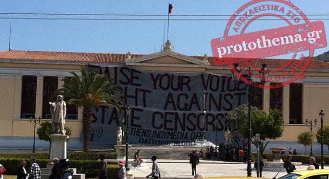 Μάλιστα, ύψωσαν στο κτίριο ένα μεγάλο πανό με την υπογραφή του Indymedia στο οποίο αναγράφεται: «Raise your voice against state Censorship».