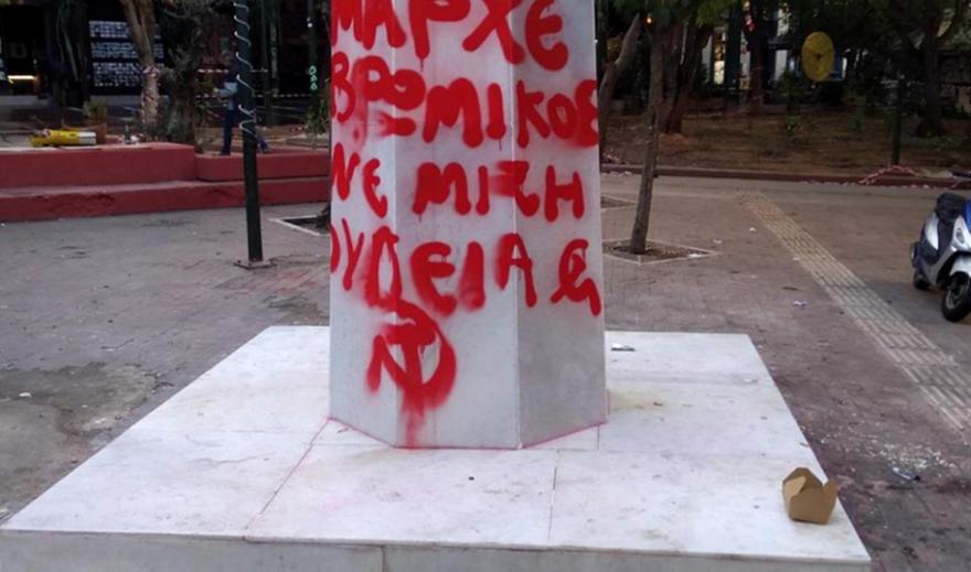 Στόχος βανδαλισμών έγινε για τρίτη φορά, το άγαλμα που βρίσκεται στο κέντρο της πλατείας Εξαρχείων.