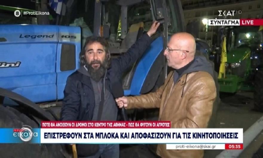 Ο αγρότης από την Αταλάντη είπε στον ρεπόρτερ του ΣΚΑΪ ότι έμεινε ξύπνιος όλο το βράδυ. «Τι να κοιμηθώ ρε φίλε! Έχεις κάνει αγρότης; Ο αγρότης δεν έχει ώρα φίλε. Από την ώρα που θα ξυπνήσει μέχρι το βράδυ, ο αγρότης είναι στο χωράφι. Μόνο η βροχή και το χιόνι μας σταματάει. Η μάνα μου στο χωράφι μας γέννησε».