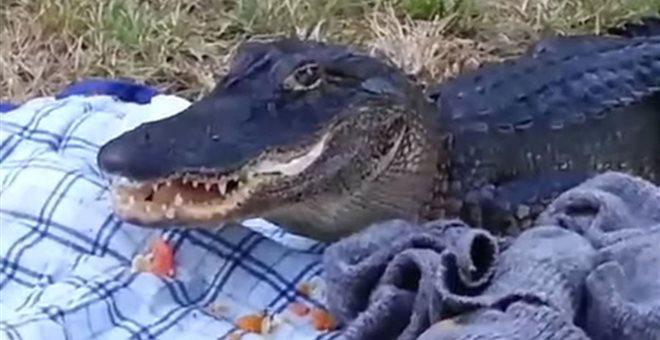 Το ζευγαράκι αντίκρισε ξαφνικά έναν αλιγάτορα να πλησιάζει την κουβέρτα που είχαν στρώσει και άμεσα τράπηκαν σε φυγή.