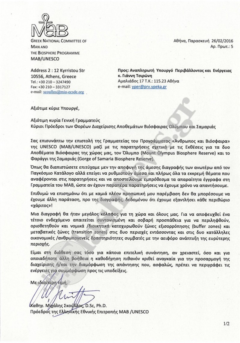 Αξίζει δε, να σημειωθεί ότι από τον κ. Σκούλλο είχε σταλεί και δεύτερη επιστολή σε προγενέστερο χρονικό διάστημα, τον Φεβρουάριο, με την οποία καλούσε τις αρχές να πράξουν τα δέοντα που ζητούσε το πρόγραμμα MAB / UNESCO, τονίζοντας μάλιστα ότι αποφύγαμε προσωρινά ως χώρα τη διαγραφή από τον παγκόσμιο κατάλογο, του φαραγγιού της Σαμαριάς (και του Ολύμπου) ωστόσο αν δεν κινηθούμε γρήγορα δενθα αποφευχθεί η διαγραφή η οποία θα αποτελούσε διασυρμό.