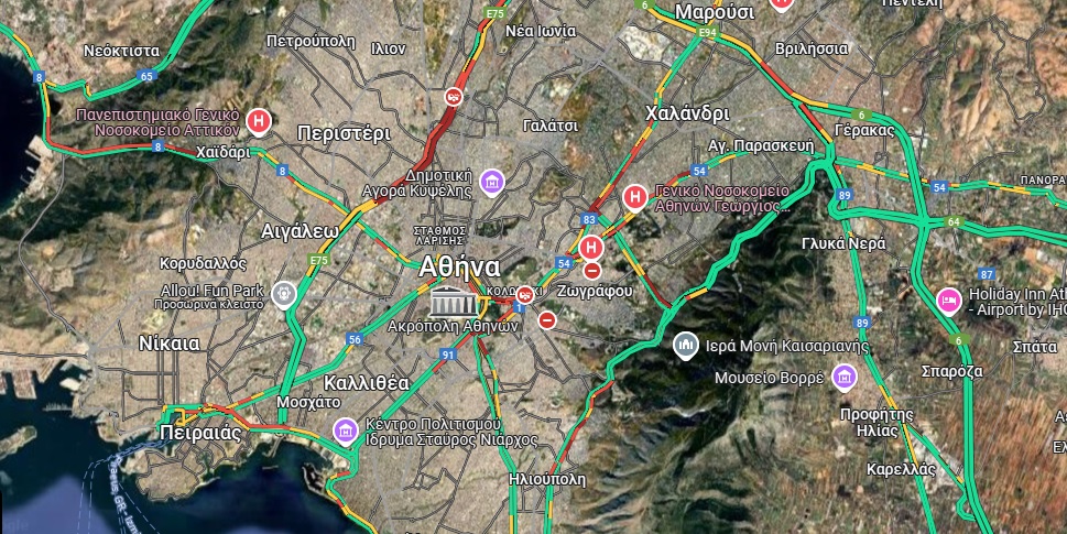 Καθυστερήσεις σημειώνονται επίσης στη λεωφόρο Κηφισού, στον Σκαραμαγκά και στην ανηφόρα της Κατεχάκη από την Ηλιούπολη προς τον Βύρωνα.