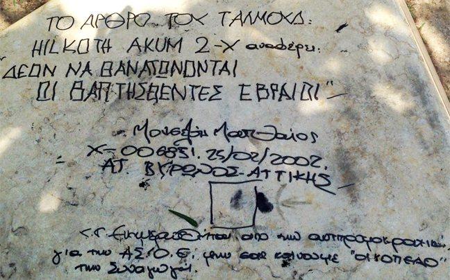 «Δυστυχώς, 70 χρόνια μετά το τέλος του πολέμου που άφησε πίσω του εκατομμύρια θύματα της μισαλλοδοξίας, του ρατσισμού, του Ναζισμού και του αντισημιτισμού, κάποιοι αμετανόητοι επιθυμούν να μας τρομοκρατήσουν ασελγώντας στη μνήμη των αδελφών μας, θυμάτων του Ολοκαυτώματος. Δεν θα καταφέρουν να μας φοβίσουν. Το αντίθετο μάλιστα. Μαζί με τους αθηναίους πολίτες, θα εντείνουμε κάθε προσπάθεια για να παραμείνει άσβεστη η μνήμη αθώων θυμάτων ώστε να εμποδιστεί το δικό τους ανίερο και προσβλητικό έργο να βιάσουν την ιστορία και να σπείρουν και πάλι μίσος και φανατισμό» τονίζεται σε κοινή ανακοίνωση της Ισραηλιτικής Κοινότητας Αθηνών και του Κεντρικού Ισραηλιτικού Συμβουλίου Ελλάδας.