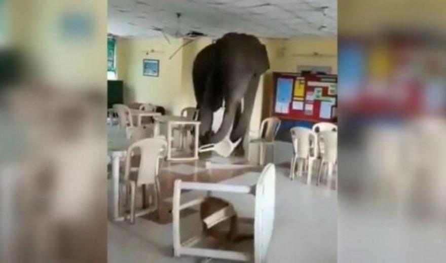 Ένας ελέφαντας μπήκε στην άδεια αίθουσα και άρχισε να παρασέρνει τραπέζια και καρέκλες. Γρήγορα τον αντιλήφθηκαν εργαζόμενοι της καντίνας και για να το φοβίσουν άναψαν έναν πυρσό και τον κουνούσαν μπροστά του για να βγει έξω.