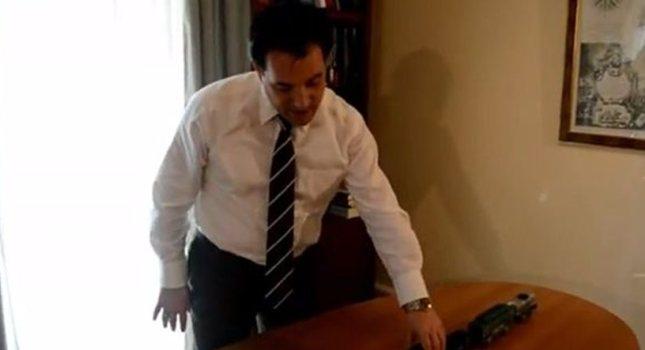 «Τι θα συμβεί όταν το μικρό τρένο ακολουθήσει πορεία σύγκρουσης με το μεγάλο τρένο όπως θέλει ο κ. Τσίπρας; Μπουμ!» ακούγεται ο υποψήφιος βουλευτής να περιγράφει την κατάσταση που θα δημιουργηθεί αν εκλεγεί κυβέρνηση ΣΥΡΙΖΑ.