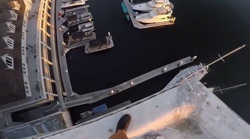 Κόβει την ανάσα το βίντεο με τον ριψοκίνδυνο άνδρα ο οποίος κάνει ένα άλμα στο κενό από τον όγδοο όροφο κτηρίου.