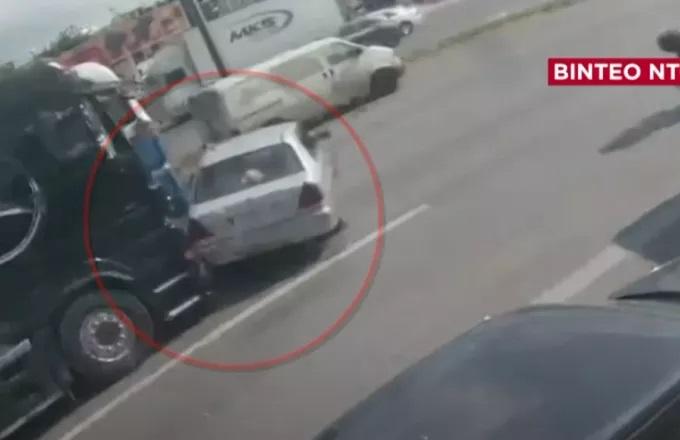 Από άγνωστη μέχρι στιγμής αιτία, το λευκό ΙΧ φαίνεται ξαφνικά να μπαίνει στη λωρίδα που κινείται η νταλίκα με αποτέλεσμα το βαρύ όχημα να μην μπορεί να σταματήσει έγκαιρα και να παρασύρει το ΙΧ.