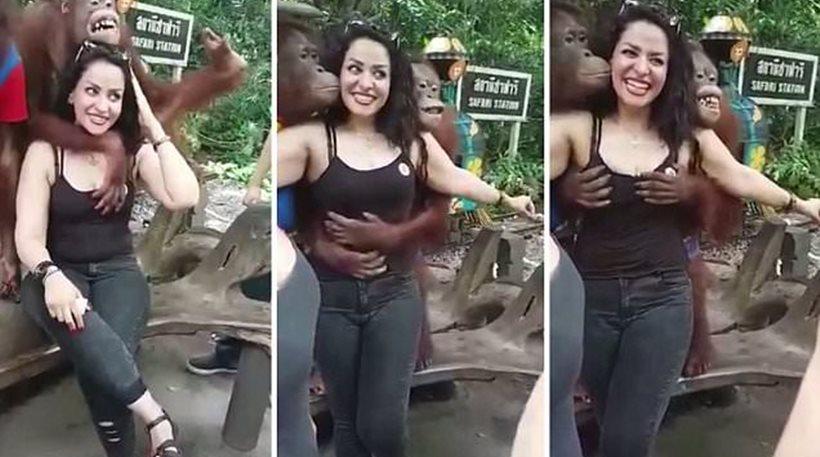 Όπως μπορείτε να δείτε στο βίντεο που κάνει το γύρο του διαδικτύου, η νεαρή γυναίκα προσπάθησε να φωτογραφηθεί με δύο από τους ουρακοτάγκους του πάρκου. Ωστόσο, ενώ όλα πήγαιναν πολύ καλά και η χαμογελαστή κοπέλα πόζαρε περιχαρής με τα δύο ζώα, η τρυφερή αγκαλιά του ενός άρχισε σιγά-σιγά να εξελίσσεται σε... χούφτωμα, με την τουρίστρια να τα χάνει προς στιγμήν και έπειτα να ξεκαρδίζεται από την ανάρμοστη συμπεριφορά του ζωηρού ουρακοτάγκου.