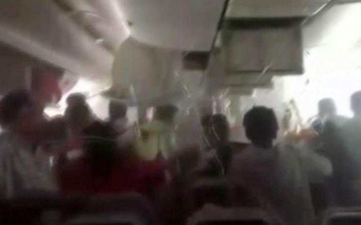 Οι επιβάτες προσπαθούν να πάρουν τις αποσκευές τους από τα ντουλάπια, πάνω από τα καθίσματά τους ενώ μια γυναίκα, προφανώς μια αεροσυνοδός, τους φωνάζει να απομακρυνθούν από το αεροσκάφος.