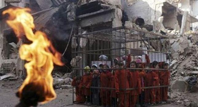 Αγόρια και κορίτσια μπήκαν σε ένα κλουβί φορώντας μία πορτοκαλί στολή αιχμαλώτου, παραπέμποντας στο σκηνικό που είχε στήσει το Ισλαμικό χαλιφάτο όταν έκαιγε ζωντανό τον Ιορδανό πιλότο.