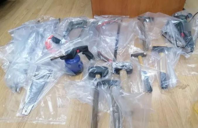 Στην αποθήκη βρέθηκαν λοστοί, βόμβες μολότοφ, βαριοπούλες, εμπρηστικοί μηχανισμοί, πριόνια, σκερπάνια και άλλα αντικείμενα.