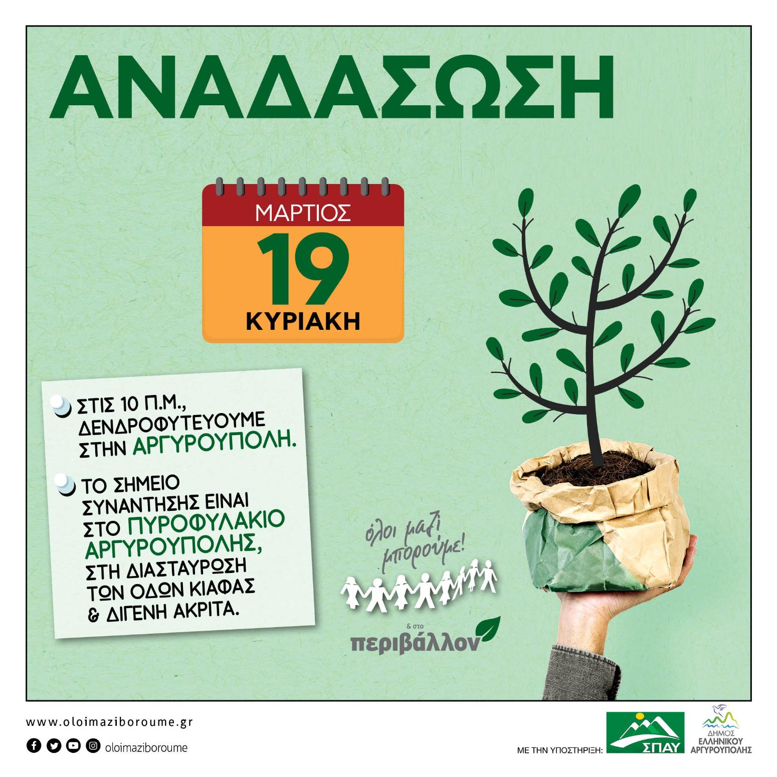 Το ΟΛΟΙ ΜΑΖΙ ΜΠΟΡΟΥΜΕ την Κυριακή 19 Μαρτίου, δενδροφυτεύει στον Υμηττό.Το σημείο συνάντησης των Εθελοντών είναι μπροστά στο Πυροφυλάκιο Αργυρούπολης, στη διασταύρωση των οδών Διγενή Ακρίτα & Κιάφα, στις 10 το πρωί.Εκεί, θα βρίσκονται όλα τα απαραίτητα εργαλεία τα οποία θα χρειαστούν οι Εθελοντές, όπως φτυάρια, τσάπες, γάντια, κ.ο.κ.