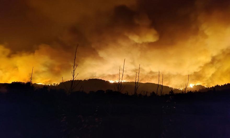 Στην Κήρινθο και τη Στροφυλιά, οι φλόγες μπήκανε στα πρώτα σπίτια και κατευθύνονται τώρα προς Ζωοδόχο Πηγή. Τα χωριά γύρω από το Μαντούδι έχουν εκκενωθεί.