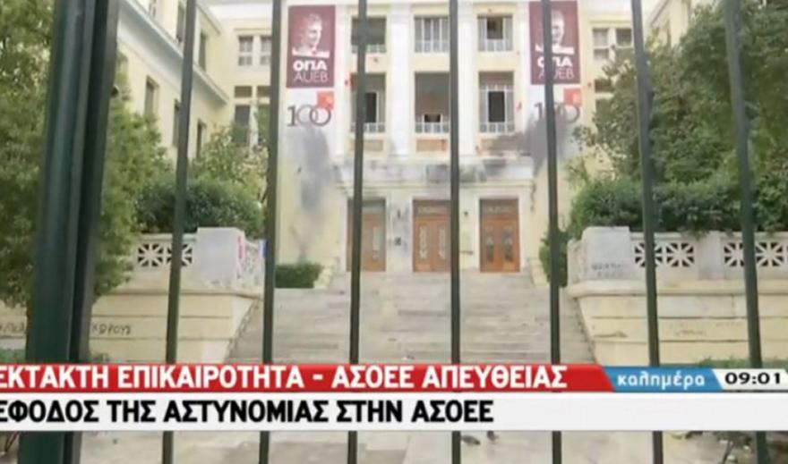 Σε εξέλιξη είναι έφοδος της αστυνομίας στην ΑΣΟΕΕ μετά τις καταγγελίες φοιτητών στον ΣΚΑΪ ότι γίνεται κατασκευή μολότοφ εντός του κτιρίου. Σύμφωνα με τις πρώτες πληροφορίες ήδη στις αστυνομικές έρευνες υπάρχουν ευρήματα, καθώς βρέθηκαν κοντάρια και κράνη.