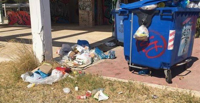 Ακόμη και οι μπλε κάδοι είναι γεμάτοι σκουπίδια και κανείς από τις αρχές δεν φαίνεται να έχει προχωρήσει στην αποκομιδή των σκουπιδιών.