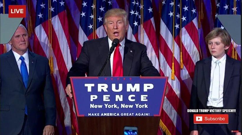 Υπό πανηγυρικούς ήχους και επευφημίες έφτασε στο βήμα ο 45ος Πρόεδρος των Ηνωμένων Πολιτειών Αμερικής Ντόναλντ Τραμπ.Το επιτελείο του επέλεξε το soundtrack της θρυλικής σαρωτικής περιπέτειας του 1997 «Air Force One» για να «συνοδεύσει» στον επινίκιο λόγο του, μετά την εκλογική αναμέτρηση θρίλερ των αμερικανικών εκλογών 2016.