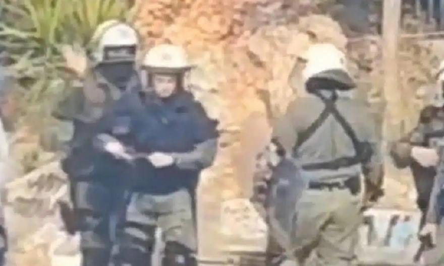 Ο τελευταίος μη φορώντας προστατευτική μάσκα και ενώ μοιάζει να δίνει εντολή στο μέλος της διμοιρίας να οπισθοχωρήσει, του ρίχνει… σφαλιάρα στο κράνος, κάνοντάς του νόημα να πάει προς τα πίσω.