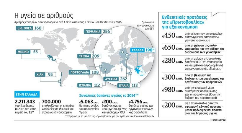 Σύμφωνα με μελέτη της «Πρωτοβουλίας», οι συνολικές δαπάνες υγείας το 2014 ξεπέρασαν τα 16 δισ. ευρώ (αντί των 14,7 δισ. ευρώ που αναγράφει στο δελτίο της η ΕΛΣΤΑΤ) εάν συνυπολογιστούν αυτές των υπουργείων Υγείας και Αμυνας, της Τοπικής Αυτοδιοίκησης, των Οργανισμών Κοινωνικής Ασφάλισης και οι δαπάνες υγείας των νοικοκυριών. Ενα μέρος αυτών θα μπορούσαν να «απελευθερωθούν» για να επενδυθούν πάλι στην υγεία αλλά σε πιο αναπτυξιακή κατεύθυνση. Ειδικότερα, σύμφωνα με την «Πρωτοβουλία», η εξοικονόμηση θα μπορούσε να έρθει από τη μείωση των εισαγωγών και επανεισαγωγών στα νοσοκομεία κατά 17% (εξοικονόμηση 450 εκατ. ευρώ), τη μείωση της συνολικής φαρμακευτικής δαπάνης κατά 15% (650 εκατ. ευρώ), τη μείωση της συνολικής δαπάνης για εργαστηριακές εξετάσεις κατά 20% (280 εκατ. ευρώ), τη βελτίωση της διοίκησης του συστήματος και οργάνωσης των προμηθειών (300 εκατ. ευρώ), από την εισαγωγή συστήματος αποζημίωσης των υπηρεσιών με βάση το αποτέλεσμα (980 εκατ. ευρώ) και την εφαρμογή εθνικού προγράμματος πρόληψης και προστασίας της δημόσιας υγείας (αρχικά 200 εκατ. ευρώ).