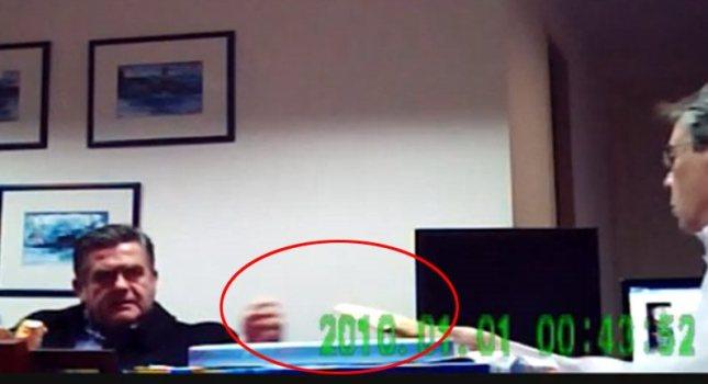 Ο Χάρης Τομπούλογλου, που υποστηρίζει πως τα χρήματα δεν ήταν μίζα αλλά τα ήθελε για να δώσει ως... δωρεά στο νοσοκομείο, φαίνεται να παίρνει τον κίτρινο φάκελο με τα χρήματα. Αφού είδε τι περιείχε, τον έβαλε στο εσωτερικό του παλτού του κι έφυγε από το γραφείο.