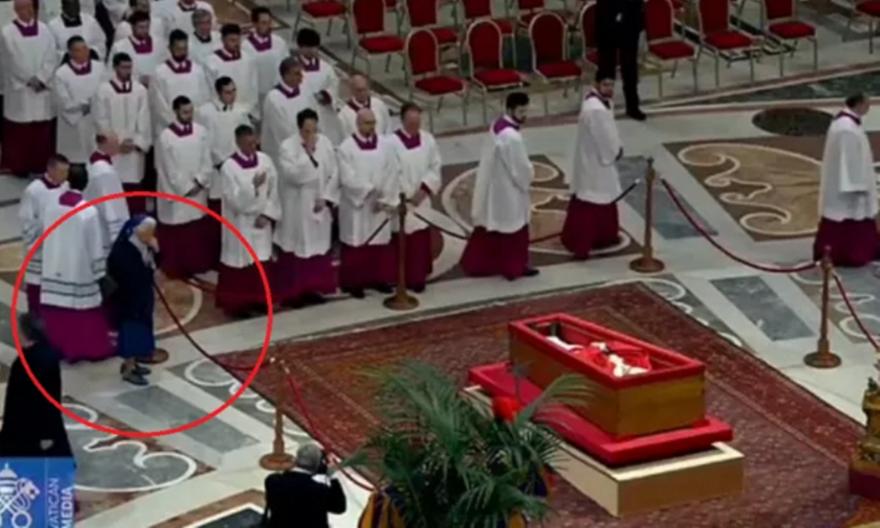 Η γαλλο-αργεντινή μοναχή, η αδελφή Ζενεβιέβ Τζενίνγκρος, εθεάθη σε πλάνα από την πρώτη μέρα του δημόσιου προσκυνήματος του Φραγκίσκου να πλησιάζει σε απαγορευμένο σημείο για να προσευχηθεί μπροστά στο φέρετρο του αείμνηστου Ποντίφικα.