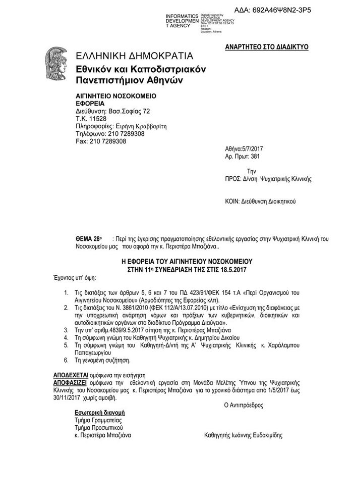Όπως αναφέρεται σε σχετική απόφαση της εφορείας του Νοσοκομείο η οποία αναρτήθηκε στο διαδίκτυο, η κ.Μπαζιάνα εργάζεται εθελοντικά στην Μοvάδα Μελέτης Ύπνου της Ψυχιατρικής Κλινικής για το χρονικό διάστημα 1/5/2017 έως 31/11/2017 και χωρίς αμοιβή.