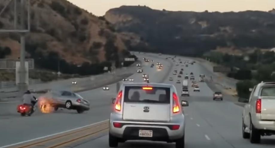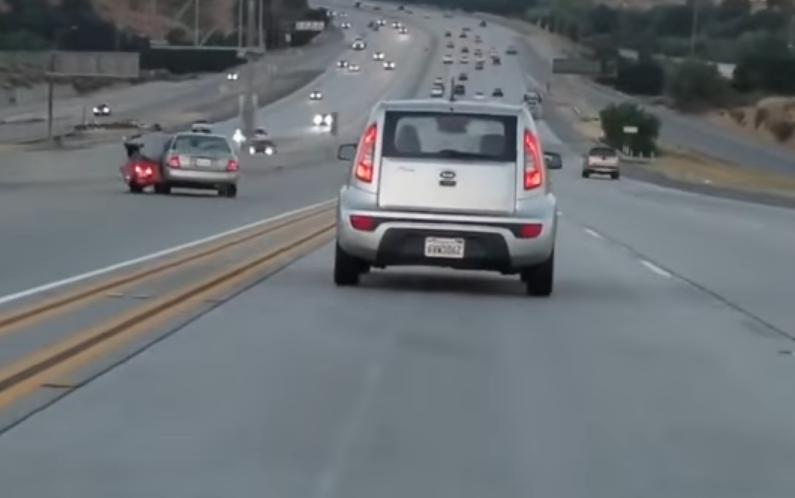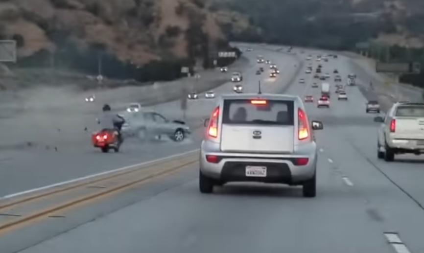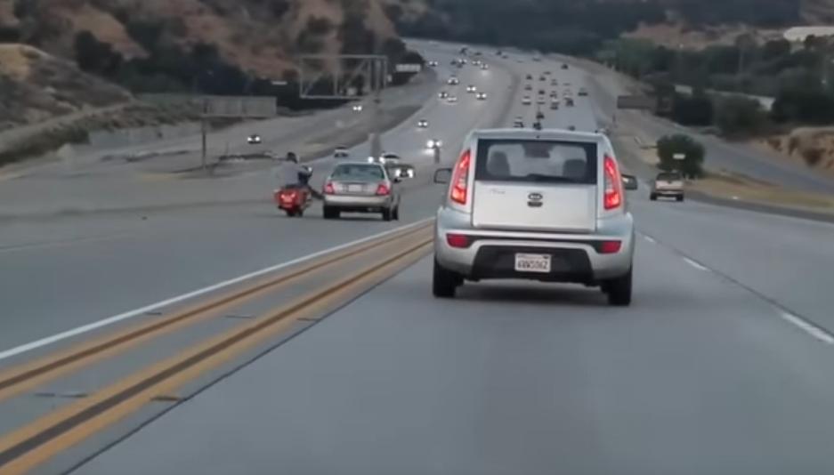 Ο αυτόπτης μάρτυς που κατέγραψε το βίντεο, ο 47χρονος Κρις Τρέιμπερ, είπε ότι πήγαινε στη δουλειά του όταν είδε το περιστατικό. Από τη θέση του συνοδηγού είδε τη μοτοσικλέτα να τον προσπερνά από την λωρίδα ταχείας κυκλοφορίας. Περίπου 100 μέτρα πιο κάτω ο Τρέιμπερ είδε το ασημί σεντάν να στρίβει για να μπει στη λωρίδα ταχείας κυκλοφορίας και παραλίγο να πέσει πάνω στο μοτοσικλετιστή. «Προφανώς ο μοτοσικλετιστής φοβήθηκε πολύ», είπε ο Τρέιμπερ προσθέτοντας ότι από τις χειρονομίες τους φαινόταν ότι οι δύο οδηγοί άρχισαν να τσακώνονται. «Κάτι θα γίνει εκεί», σκέφθηκε ο Τρέιμπερ. Και μέχρι να αρχίσει να βιντεοσκοπεί το περιστατικό, ο μοτοσικλετιστής είχε απλώσει το πόδι και κλωτσούσε το ΙΧ.