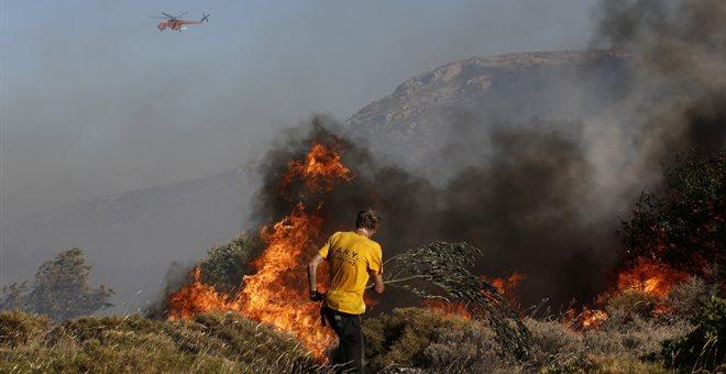 Η φωτιά καίει χαμηλή βλάστηση και είναι σε λόφο, ωστόσο το μέτωπό της είναι κοντά σε κατοικημένη περιοχή.