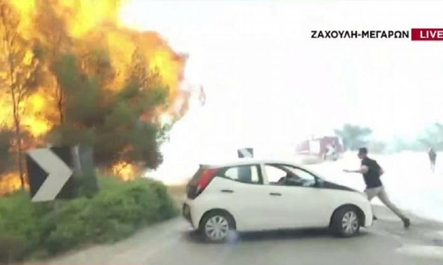 Στιγμές αγωνίας για το συνεργείο του ΣΚΑΪ στα Μέγαρα. Κατά τη διάρκεια της ζωντανής σύνδεσης από το πύρινο μέτωπο, οι φλόγες φούντωσαν και έφτασαν μια ανάσα από αυτούς.
