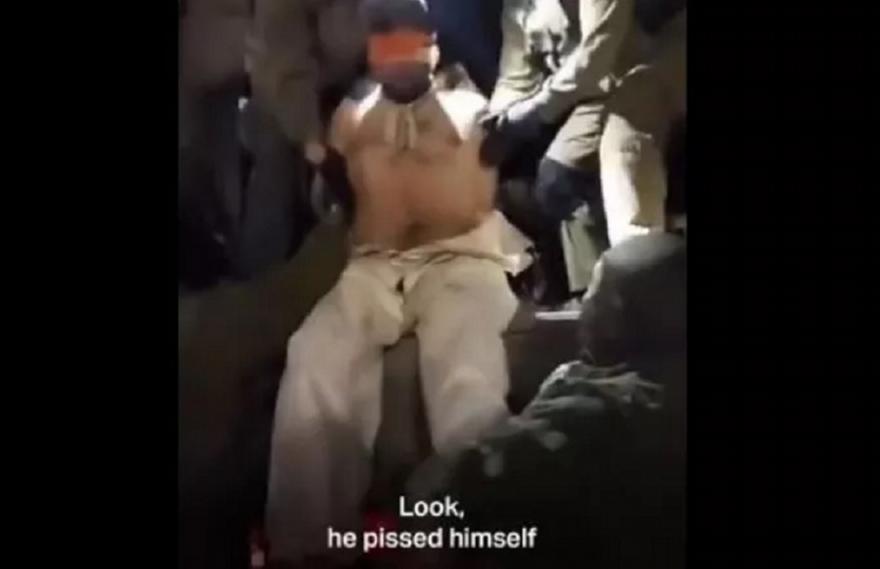 Στρατιώτες τον κατεβάζουν από ένα όχημα και στη συνέχεια ακούγεται η φωνή αυτού που τραβάει το βίντεο να μιλά στα γαλλικά και να λέει: «κατουρήθηκε πάνω του. Θα σου δείξω την πλάτη του, θα σπάσεις πλάκα, τον βασάνισαν για να μιλήσει», ενώ ταυτόχρονα βρίζει τον κρατούμενο