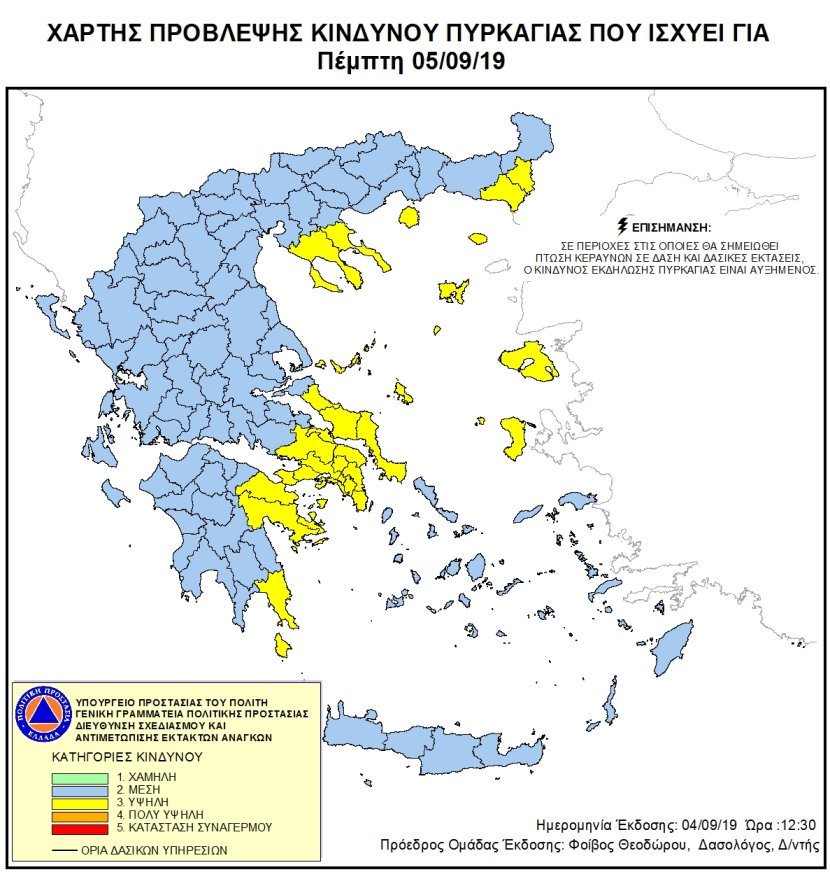 Υψηλός (επίπεδο 3) είναι ο κίνδυνος εκδήλωσης πυρκαγιάς για αύριο, Πέμπτη 5/9, σε Αττική, Βοιωτία, Εύβοια, Σκύρο, Σποράδες, Χαλκιδική, Έβρο, Θάσο, Νησιά Βορείου Αιγαίου, Κύθηρα, Λακωνία, Αργολίδα & Κορινθία.